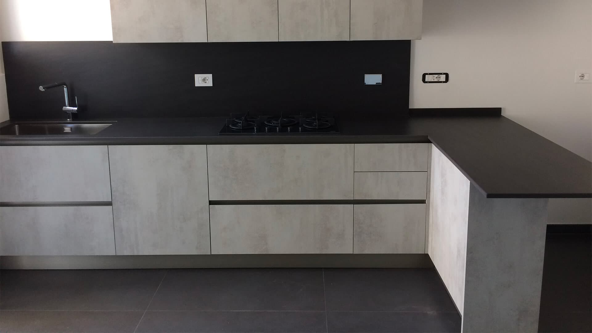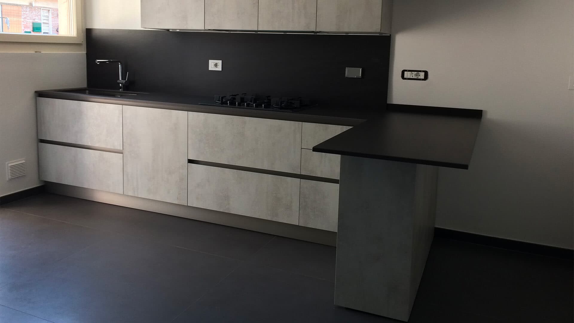 Realizzazione cucina Dibiesse modello Play lab in melaminico effetto cemento con top in laminato sp.2 cm.